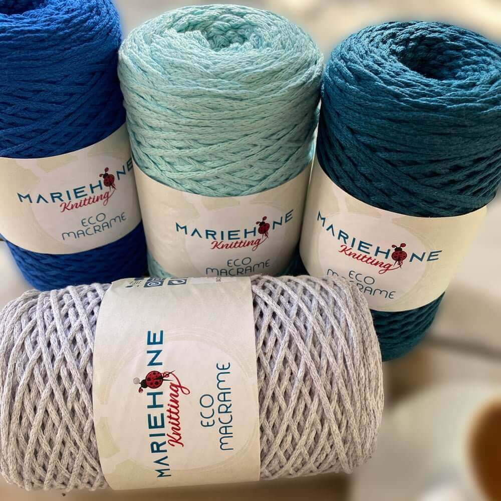 Mariehone’s Eco-Macrame Yarn is 100% Recycled Cotton 250g. 225m. This yarn in the form of a cord is specially designed for weaving macrame openwork crafts. Also suitable for crocheting and knitting. The yarn line will delight you with a diverse color palette, all colors of the Eco Macrame are perfectly combined with each other. Sustainable and soft this cotton yarn pleasant to the body. Mariehone’s Eco Macrame Cotton yarn can be used to knit original capes, shawls, as well as handbags and hats, also macrame projects.